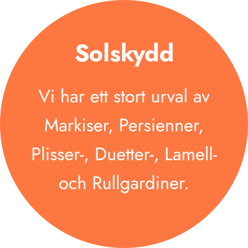 Solen är skön och efterlängtad, ändå kan man vilja stänga den ute ibland. Då har vi lösningen för dig. Vi har ett stort urval av Markiser, Persienner, Plisser-, Duetter-, Lamell- och Rullgardiner! Besök gärna vår solskyddsutställning. Där finns många olika solskydd som säkert passar dina behov.