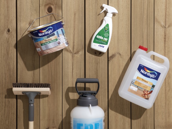 TvÀttprodukter för altanen/terrassen/trallen frÄn Nordsjö, Biokleen, SiOO:X och Jotun